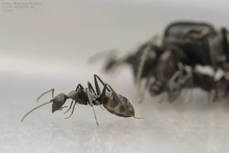 Workers are polymorphic, appearing in three different sizes (minor, media, and major) within the colony. They have a robust body structure, and are strong and resilient. Their matte black coloration is made even more striking by a silvery sheen, especially noticeable on the striped pattern of the gaster, which is a distinctive feature of this species. In addition to spraying formic acid, they use their powerful mandibles for defense.